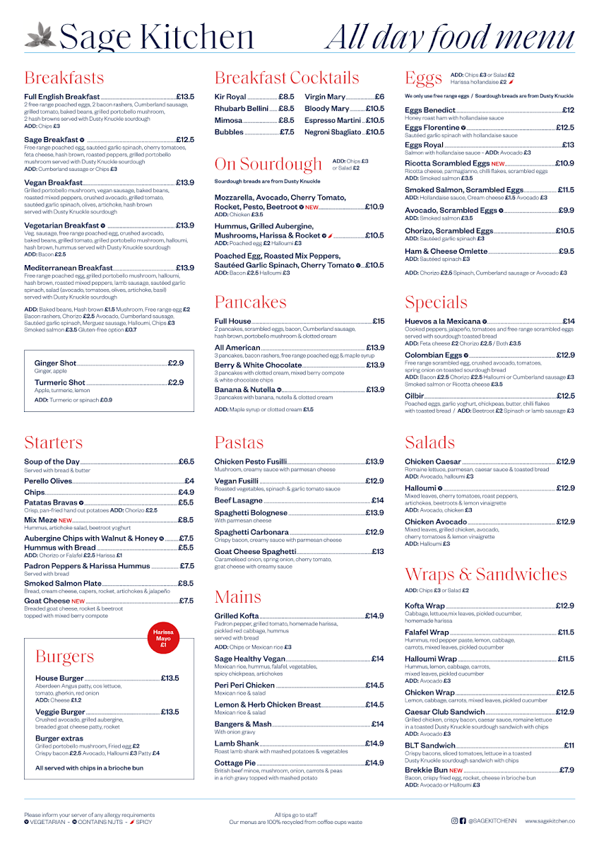 Welcome to Sage Kitchen, an inviting café nestled in Finsbury Park, London, known for its warm ambiance and delightful culinary offerings. The menu features a blend of gourmet burgers like the House Burger (£13.50), alongside enticing breakfast options such as Huevos A La Mexicana (£2.50) and Colombian Eggs (£12.90). Whether you’re in the mood for a quick bite like a Chicken Wrap or a more leisurely meal like a Caesar Club Sandwich, Sage Kitchen delivers quality that speaks to the heart of comfort food.